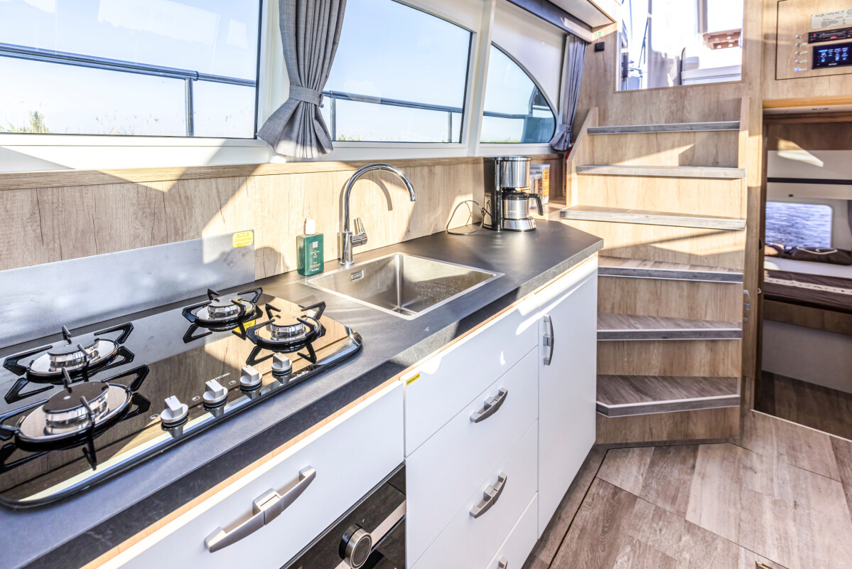Deze Aquanaut Drifter Jubilé 390 heeft 3 slaaphutten met tweepersoonsbed, 2 toiletten en een separate douche. De keuken en salon zijn op dezelfde etage, zodat u prachtig uitzicht heeft op het water. De stuurstand zit boven onder de tent, samen met een zithoek op het achterdek. De stuurstoel is zo om te zetten zodat u met z’n allen aan tafel kunnen zitten.